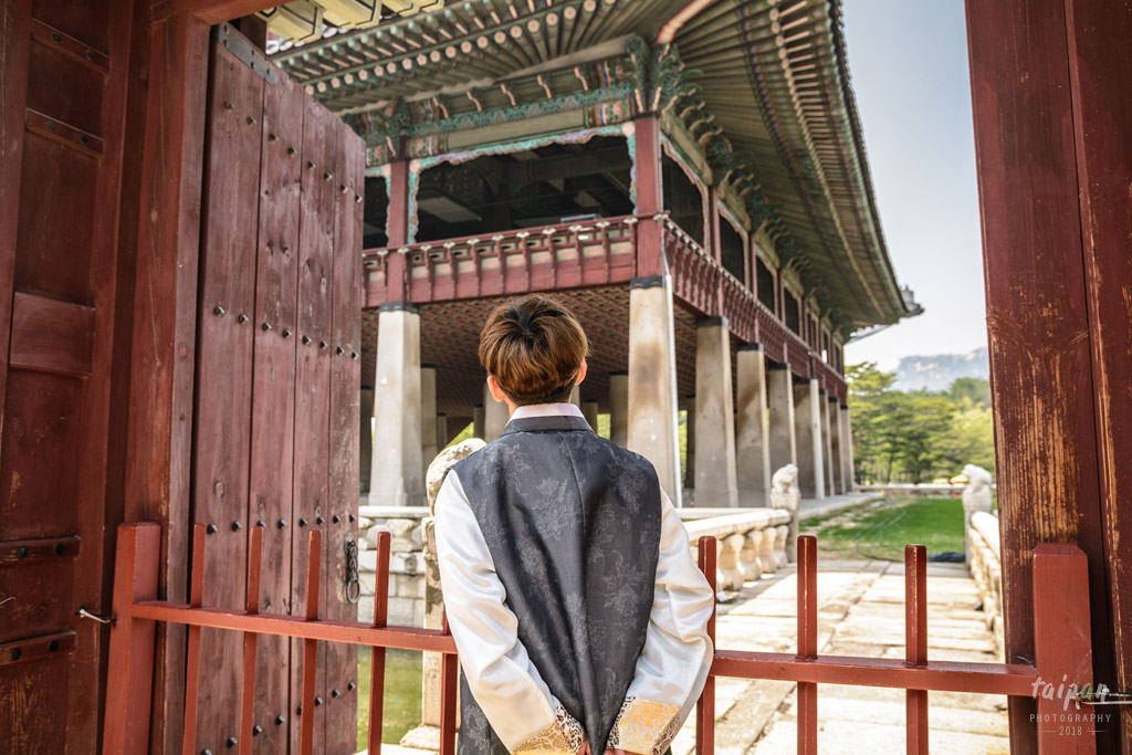 Również mężczyźni ubrani są w tradycyjne stroje. W tle Gyeonghoeru (Królewska Sala Bankietowa).