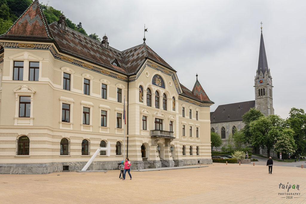 Narodowe archiwum Liechtensteinu przy głównej ulicy Vaduz, a w tle katedra