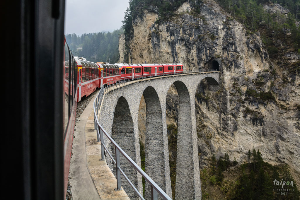 Wiadukt Landwasser (65 m). Między miastami Chur i Tirano (Włochy) kursuje panoramiczny pociąg Bernina Express. Jego trasa wiedzie przez Alpy, pokonując 55 tuneli, 196 mostów i wzniesień. Najwyższy punkt przejazdu wynosi 2253 m n.p.m. Trasa, wybudowana w latach 1908-1910, wpisana jest na listę światowego dziedzictwa UNESCO.