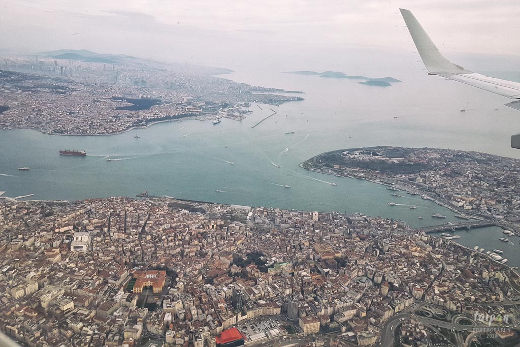 Piękny widok podczas lądowania na cieśninę Bosfor i otaczające ją miasto