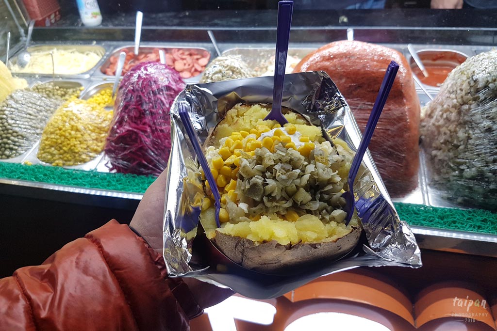 Kumpir - duży pieczony ziemniak z masą serowo-ziemniaczaną z różnymi dodatkami i przyprawami