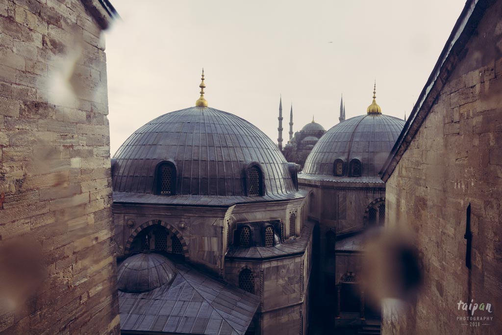 W oddali znajduje się Błękitny Meczet widziany z Hagia Sofii