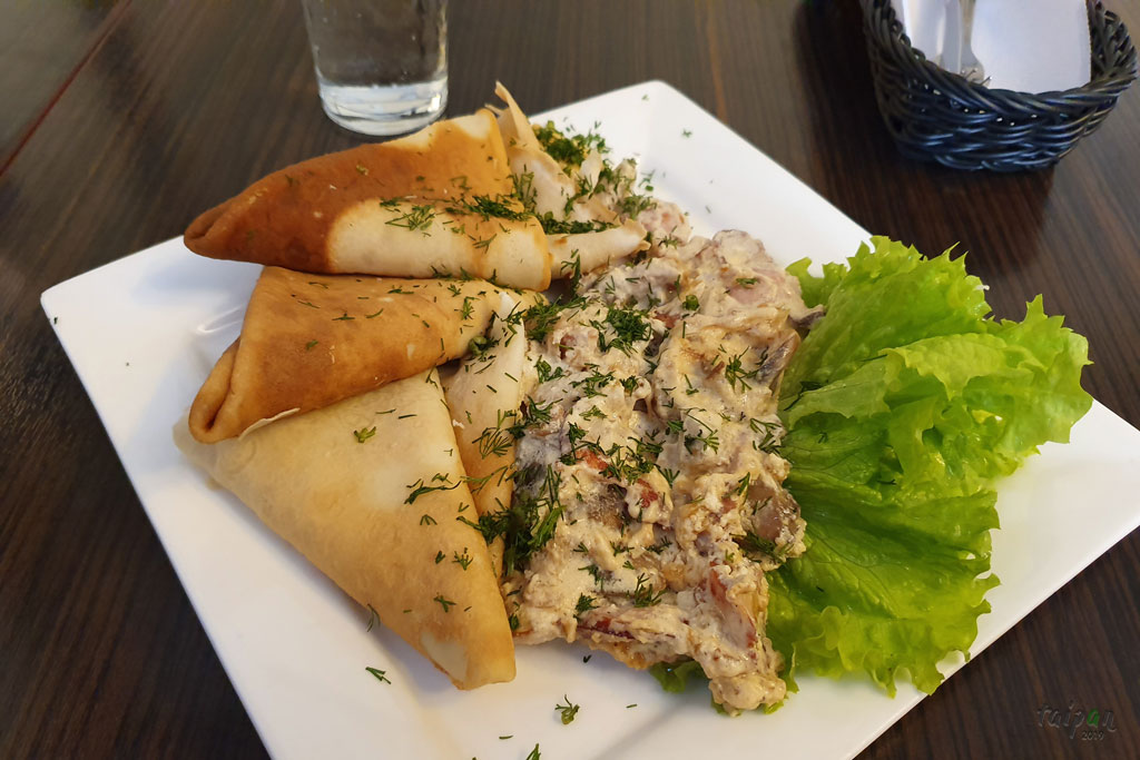 Maczanka - potrawka wieprzowa z sosem na śmietanie podana z blinami