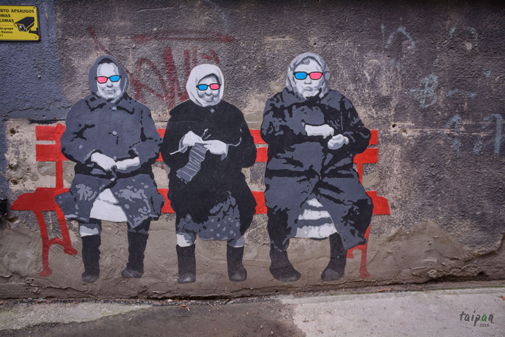 Kiemo Galerija - podwórkowa galeria, artystyczna wizja mająca łączyć sąsiadów. W podwórku opowiadana jest przede wszystkim historia okolicznych mieszkańców za pomocą różnych instalacji lub murali. Na zdjęciu - babcie siedzące na ławeczce.