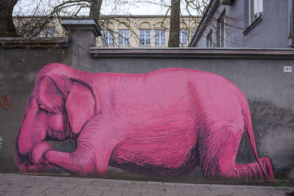 Kowno to miasto murali. Różowy słoń uwieczniający wielką miłość.