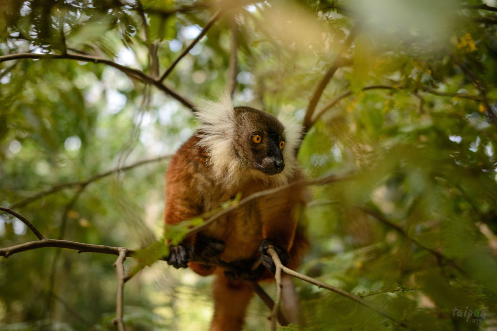 Endemiczny gatunek lemurii czarnej (lemur mokok) - kolor rudy z białym brzuchem jest charakterystyczny dla samic