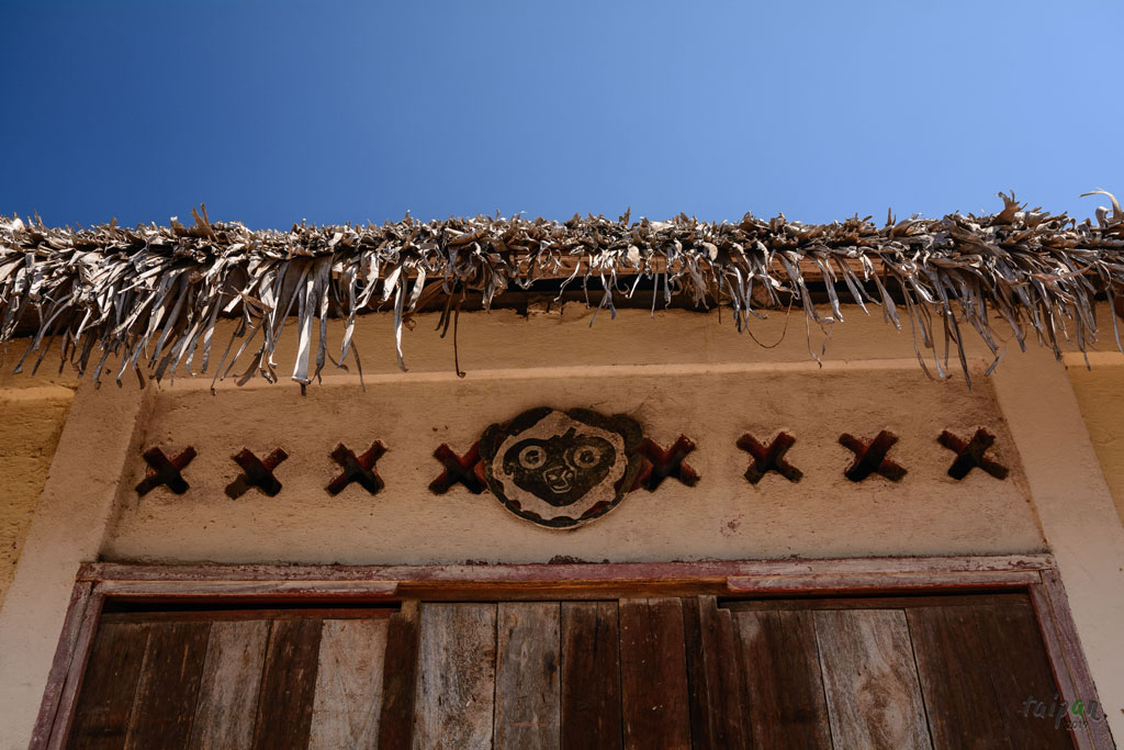 Drewniana postać lemura zawieszona nad wejściem jedengo z murowanych domów