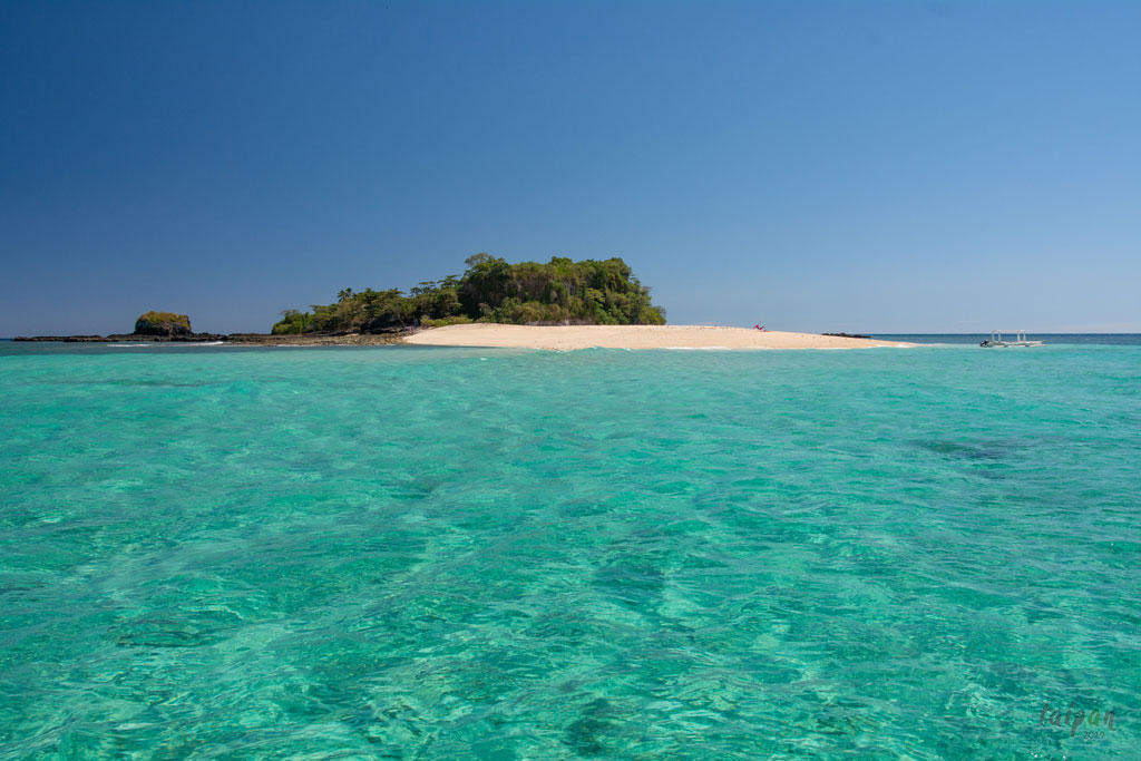 Otoczona lazurową wodą bezludna wyspa z długą odkrytą plażą, na której znajduje się wyrzucona rafa koralowa