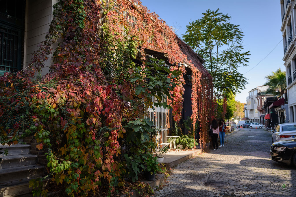Jesienne kolory bluszczu pokrywającego jeden z budynków