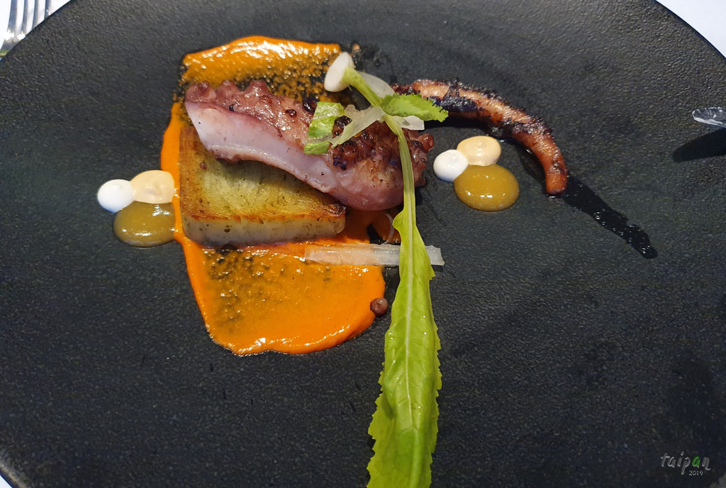 Nowoamerykańska kuchnia w restauracji Asiate - na zdjęciu ośmiornica podana na rozwarstwionym ziemniaku.