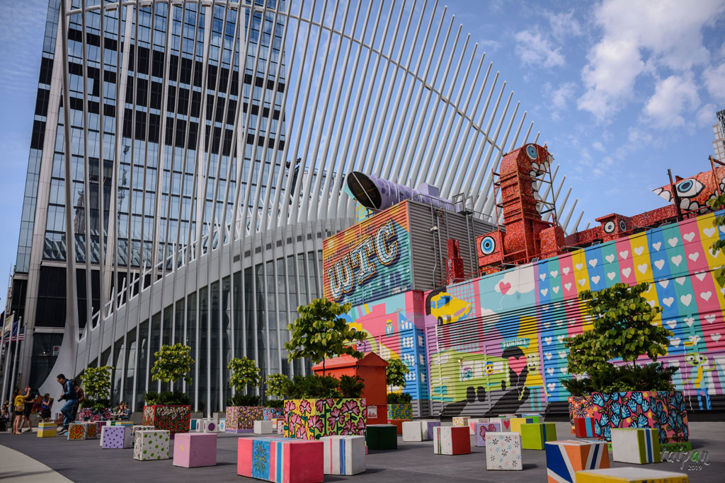 Stacja kolejowa PATH World Trade Center przypominająca katedrę na tle kolorowej instalacji