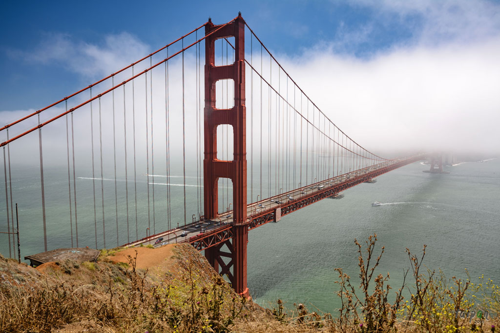 Most Golden Gate widziany z punktu widokowego Battery Spencer. Przejeżdża przez niego około 3,5 miliona samochodów miesięcznie. Most przetrwał wszystkie trzęsienia ziemi od 1937 roku, czyli od chwili otwarcia.