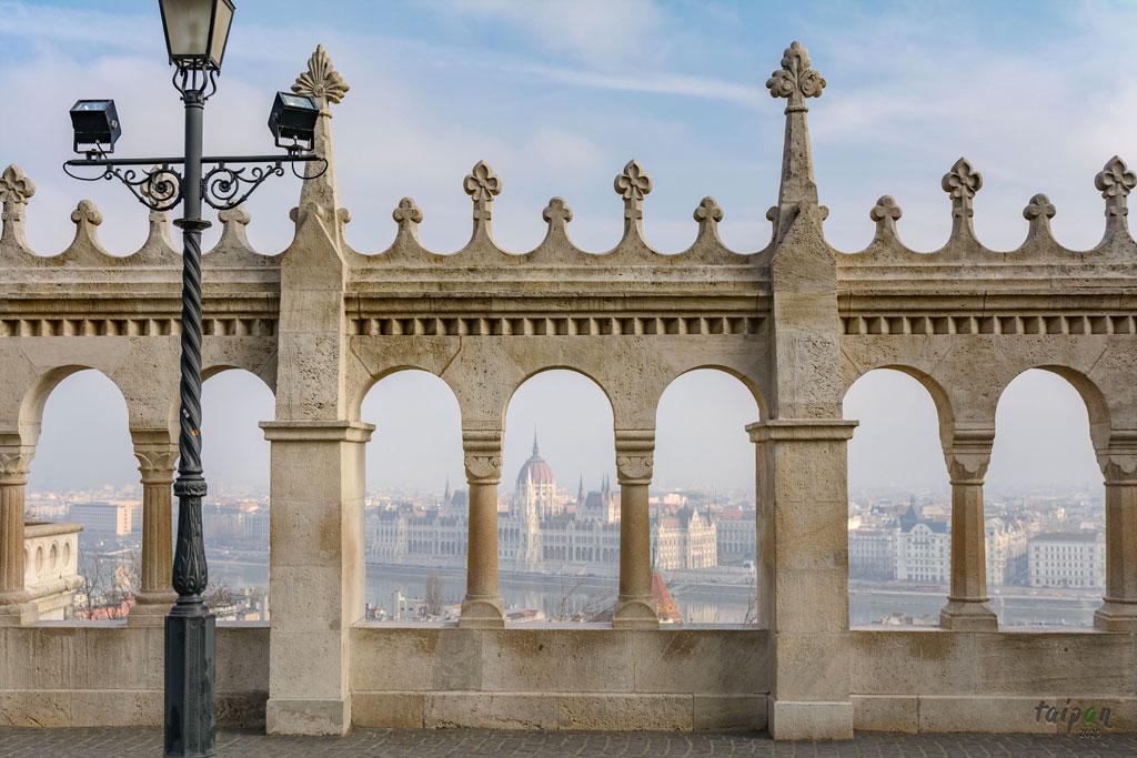 Z wież i tarasów Baszty Rybackiej rozciąga się widok na Dunaj i budynek parlamentu