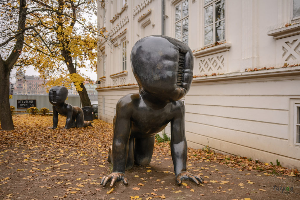Rzeźby raczkujących niemowląt autorstwa Davida Černego. Napędzane monetami niemowlęta mogą symbolizować niedojrzałą, kierującą się rządzą zysku kulturę.