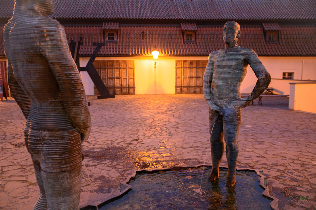 Rzeźba \„Sikający\” przedstawia dwóch mężczyzn oddających mocz na… mapę Republiki Czeskiej. Autorstwa prowokacyjnego Davida Černý.