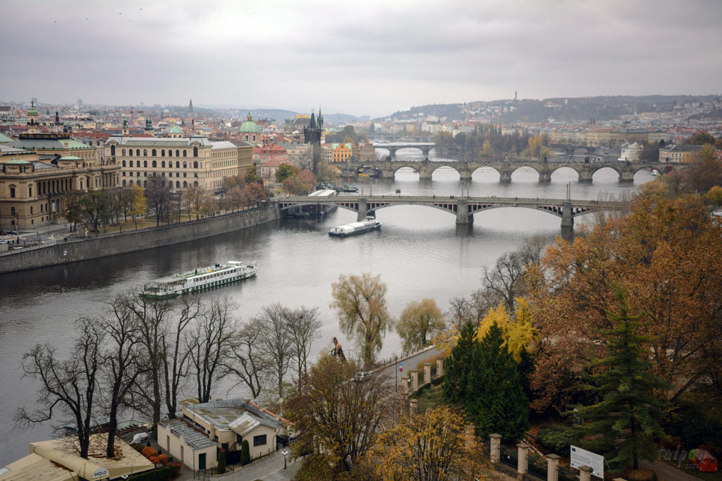 Widok na mosty na Wełtawie z punktu widokowego Vyhlídka w parku Letne