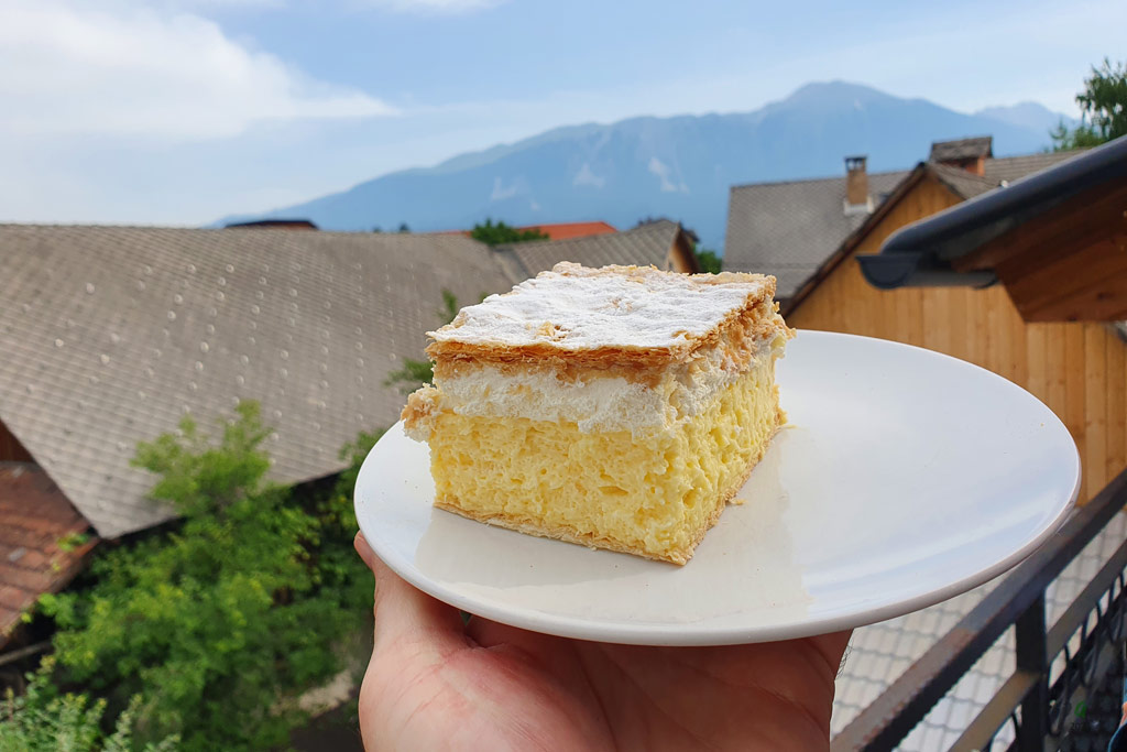 Kremna Rezina (Kremówka) - bardzo słodka wizytówka Bledu. Ciasto francuskie wypełnione śmietaną. Przypomina kremówki z Wadowic.