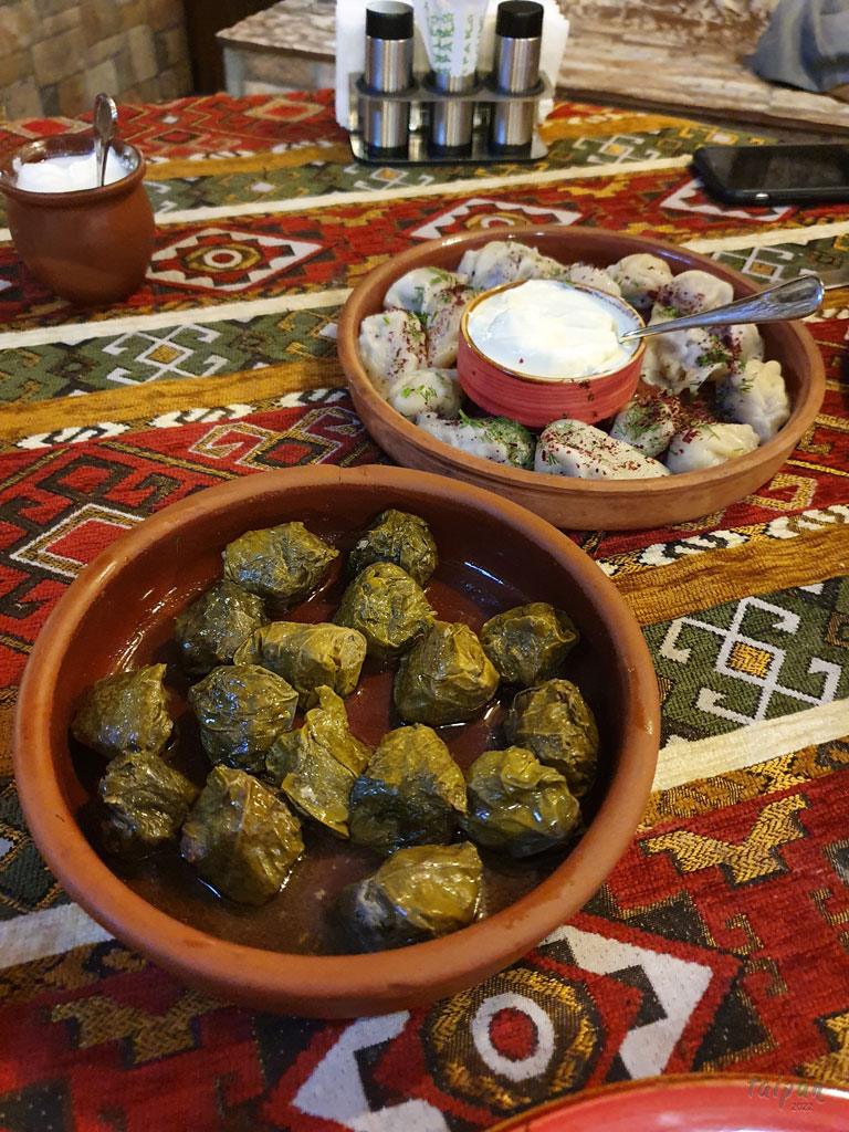 Dolma - faszerowane liście winorośli podawane z jogrutem, tutaj w wersji na ciepło. Z tyłu znajduje się gurza – pierożki z baraniną oraz