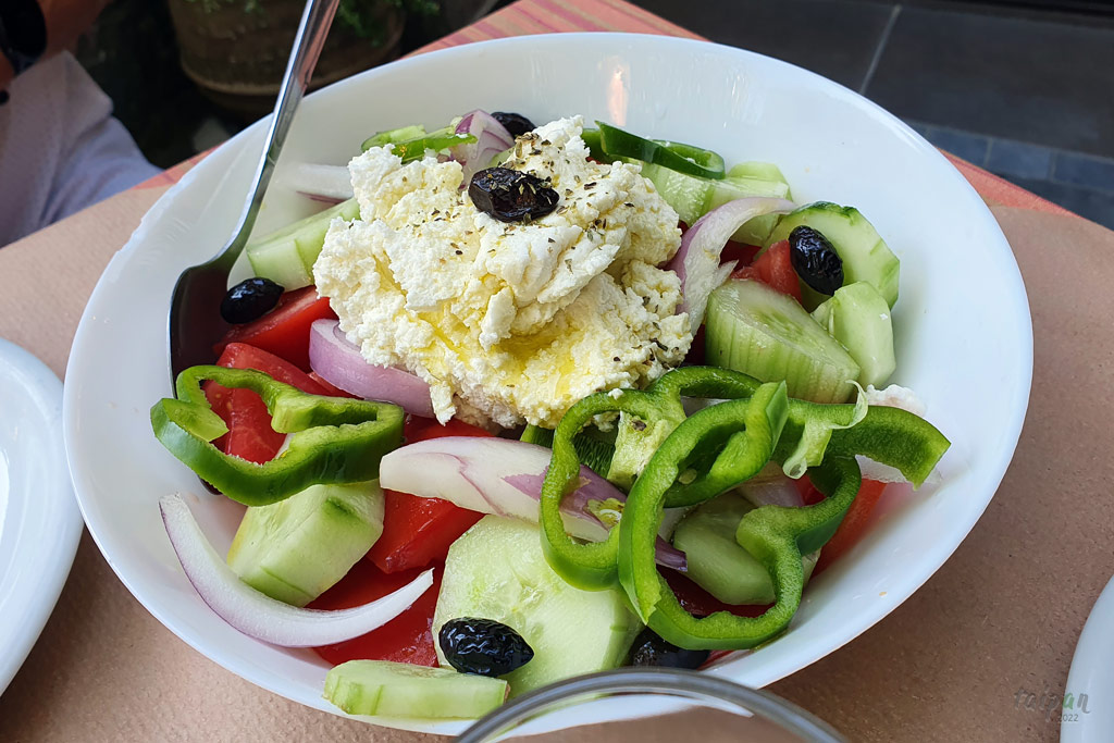 Tradycyjna sałatka kreteńska stanowi połączenie sałatki greckiej z pieczywem dakos (jęczmienne suchary) i sera mizithra
