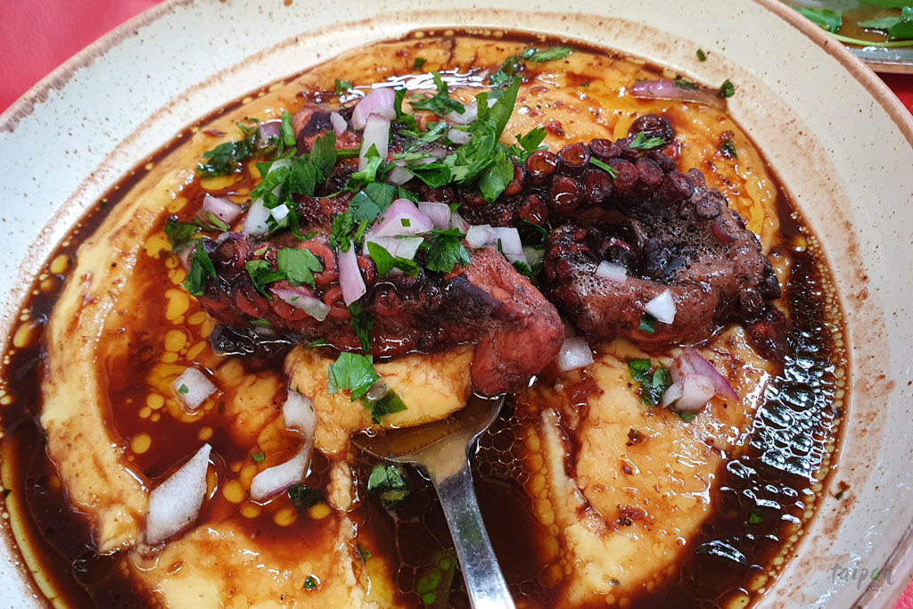Ośmiornica z favą (puree z żółtego łuskanego groszku)