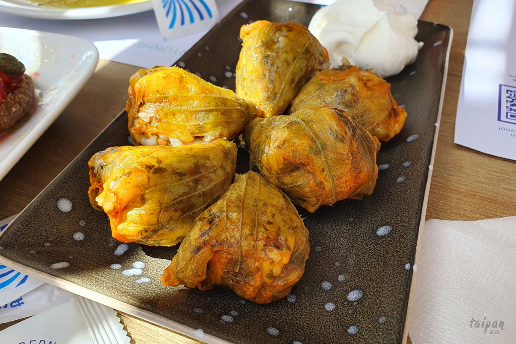 Dolmades / dolmadakia - greckie gołąbki z samym ryżem, ziołami i sokiem z cytryny, tutaj w wersji w kwiatach cukinii zamiast winogron