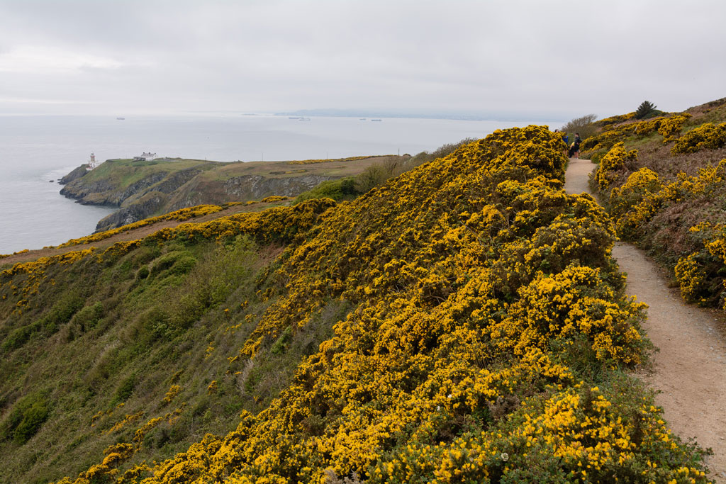 Ścieżkę Howth Cliff Path porasta kolcolist z żółtymi kwiatami