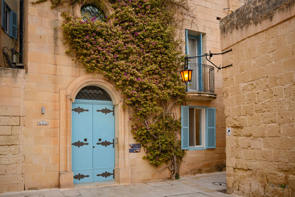 Niebieskie drzwi i okiennice na tle wijącego się po ścianie drzewa