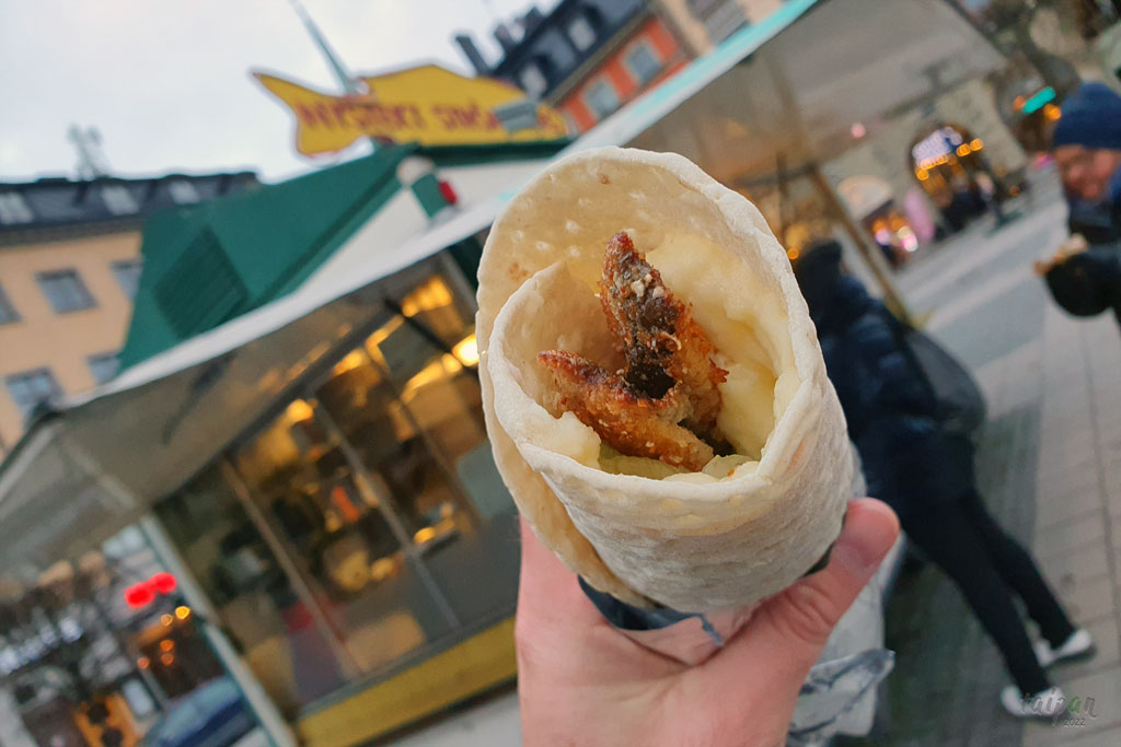 Śledzie bałtyckie podane w formie fast foodowej. Można ich spróbować w budce Strömmingsvagnen na Gamla Stan. Tutaj głęboko smażony śledź został połączony z puree ziemniaczanym, surówkami zawinięty w naleśnik.
