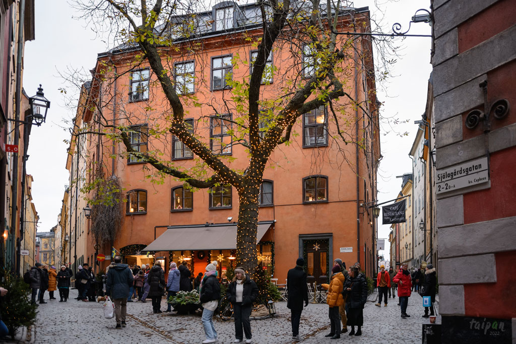 Plac Brända Tomten z charakterystycznym drzewem na wyspie Gamla stan.
