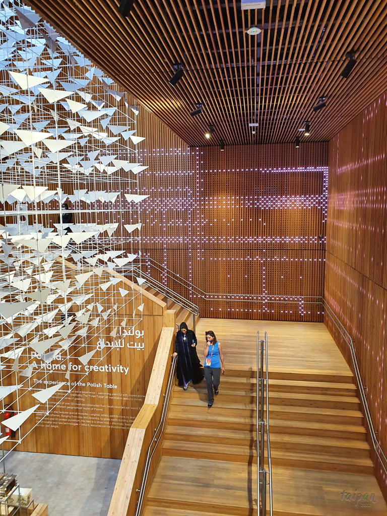 Minimalistyczny, drewniany pawilon Polski, z instalacją naśladujacą ptaki. Został wybrany najładniejszym pawilonem na Expo w kategorii dużych pawilonów (Best Large Pavilion).