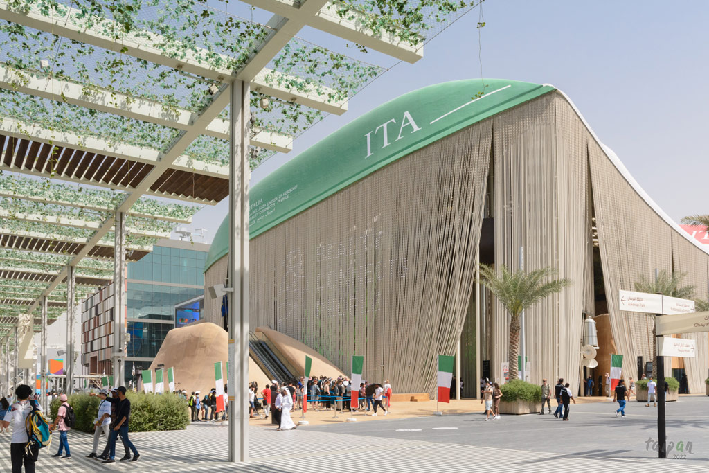 Pawilon Włoch z gigantyczną kurtyną z grubych lin wykonanych z przetworzonego plastiku.