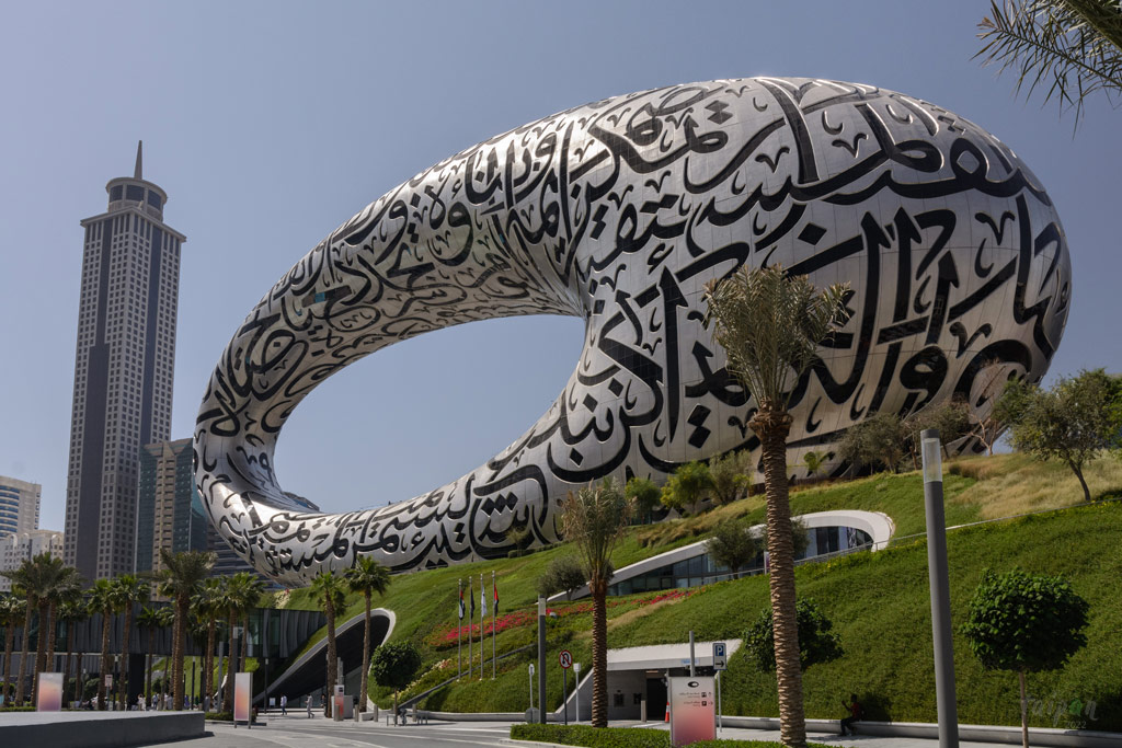 Muzeum Przyszłości to futurystyczny budynek o kształcie elipsy, z arabskimi inskrypcjami na elewacji.