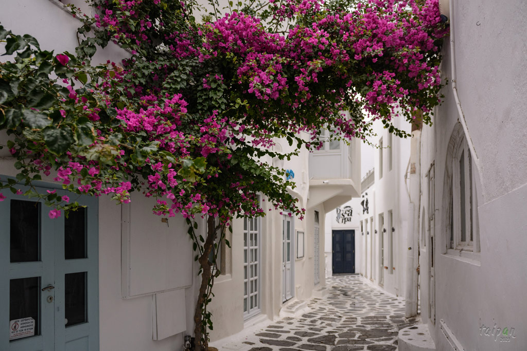 Biel budynków przeplatana jest również kolorowymi kwiatami.