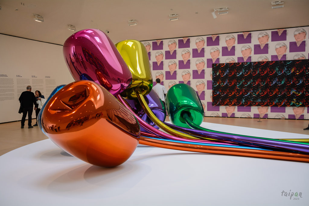 Rzeźba "Tulipany" - autorstwa Jeffa Koons, 7 kolorowych tulipanów, przypominających balony. W tle widać również obraz Andy’ego Warhola.