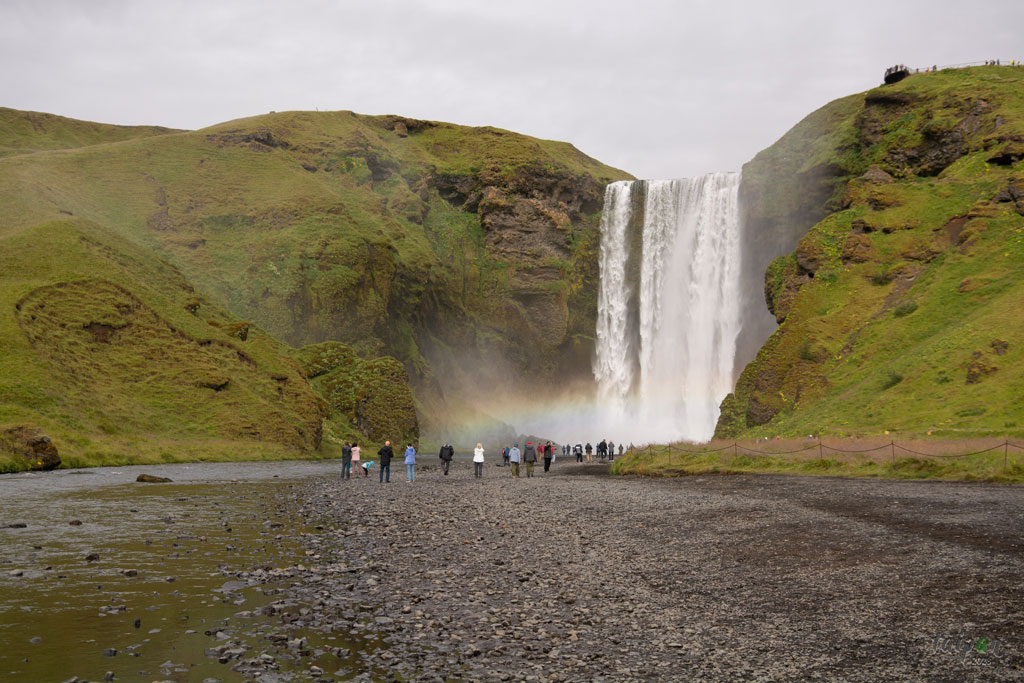 Ze względu na rozpylaną wodę pod wodospadem Skógafoss często widoczna jest tęcza. Nawet podczas deszczu jak widać na zdjęciu.