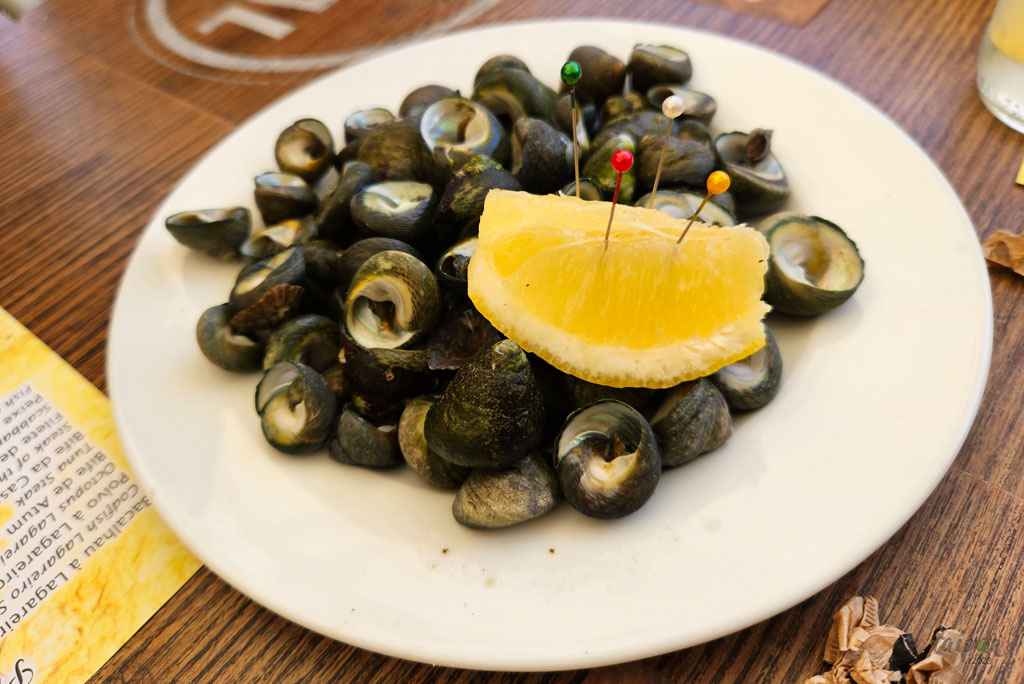 Malutkie zapiekane ślimaki morskie (caramujos) podawane z cytryną. Ślimaki wydłubuje się szpilką. Drugi raz bym ich nie zamówił, mają w sobie za dużo piasku i za dużo jej dłubaniny przy jedzeniu.