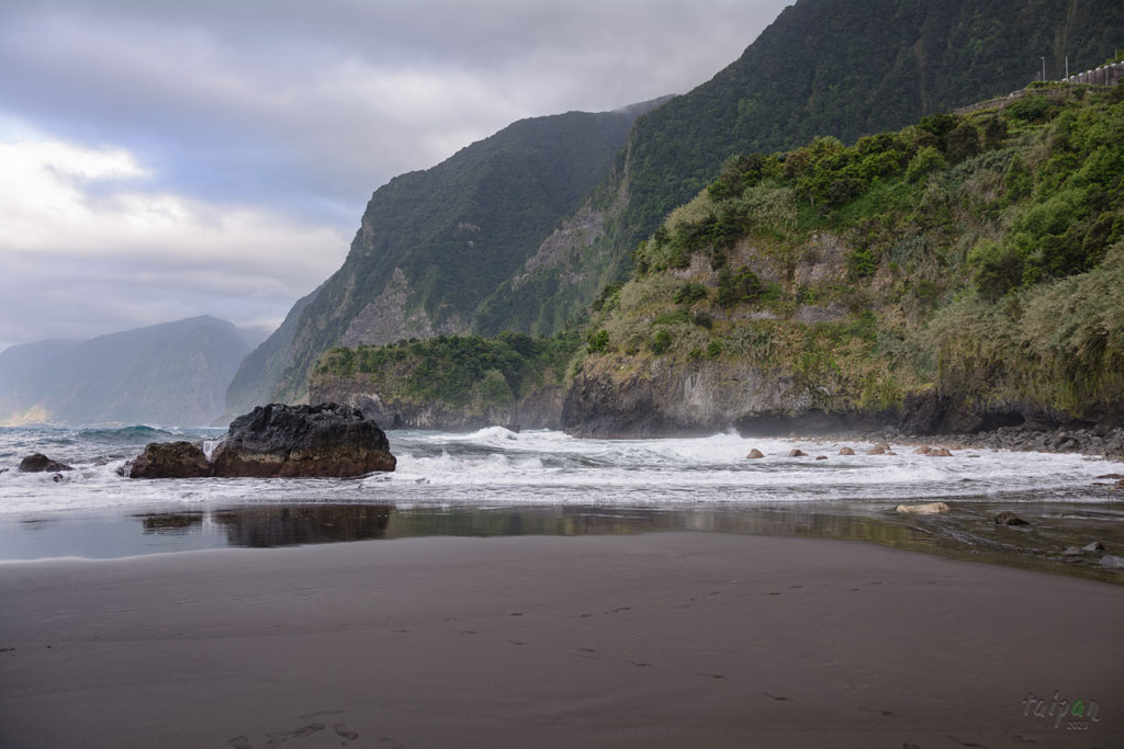 Praia do Porto do Seixal, jest to plaża z czarnym piaskiem, krystalicznie czystą wodą, niesamowitymi klifami porośniętymi bujną roślinnością.