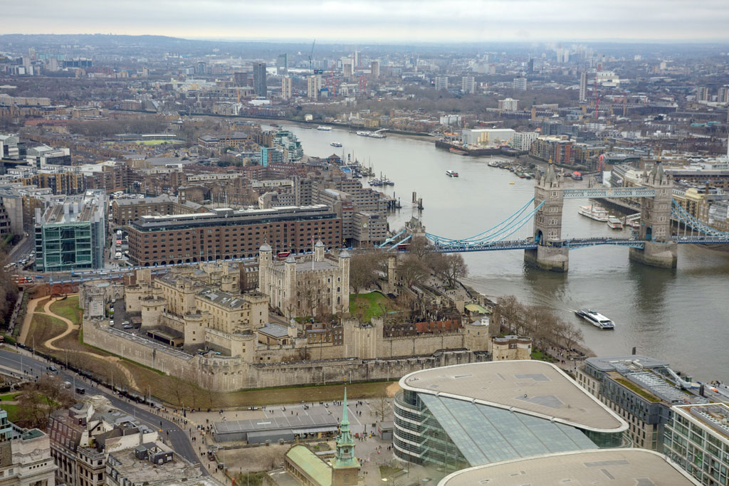 Tower of London i Tower Bridge widziane z tarasu widokowego Sky Garden