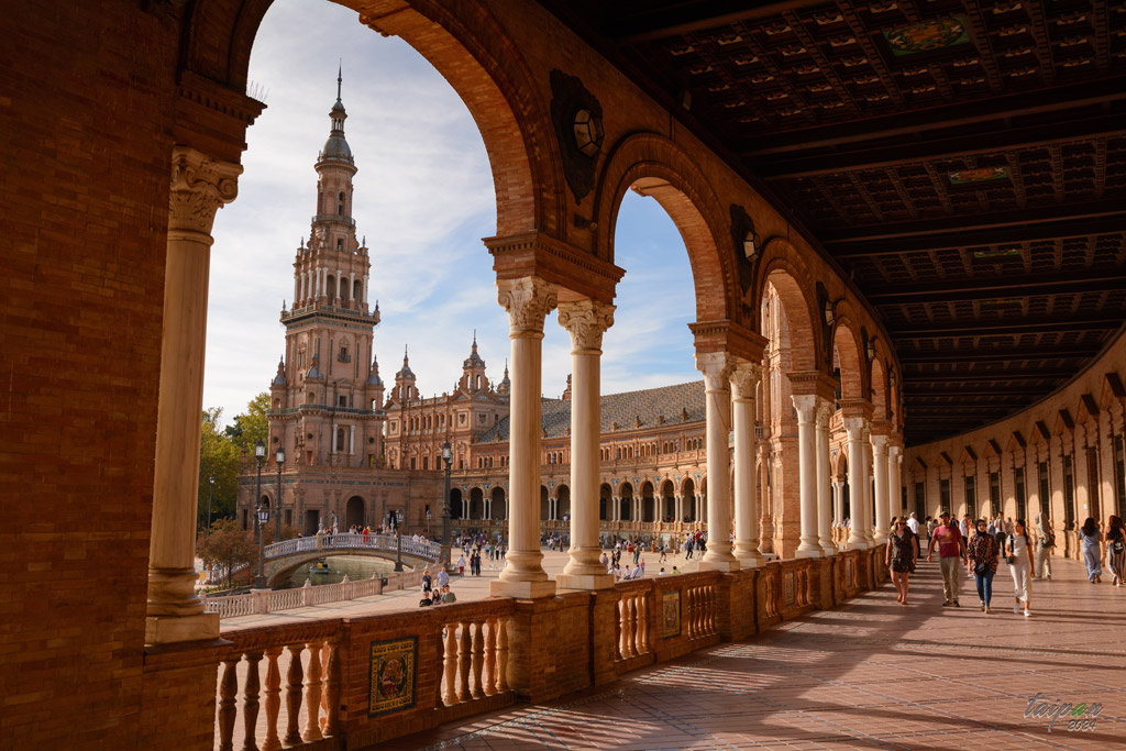Plac Hiszpański powstał w 1929 roku. Na jego terenie znajdują się bogato zdobione Pawilon Hiszpanii, mała architektura oraz sztuczny kanał. Uznawany za jeden z najpiękniejszych zespołów architektonicznych na świecie.