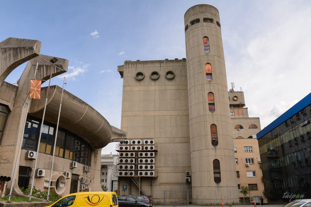 Skopje, stolica dawnej Jugosłowiańskiej Socjalistycznej Republiki Macedonii, w znacznej mierze brutalistyczne oblicze uzyskało w wyniku odbudowy po trzęsieniu ziemi w 1963 roku. Na zdjęciu budynki Centrum Telekomunikacyjnego i Siedziby Poczty według projektu Janko Konstantinova.