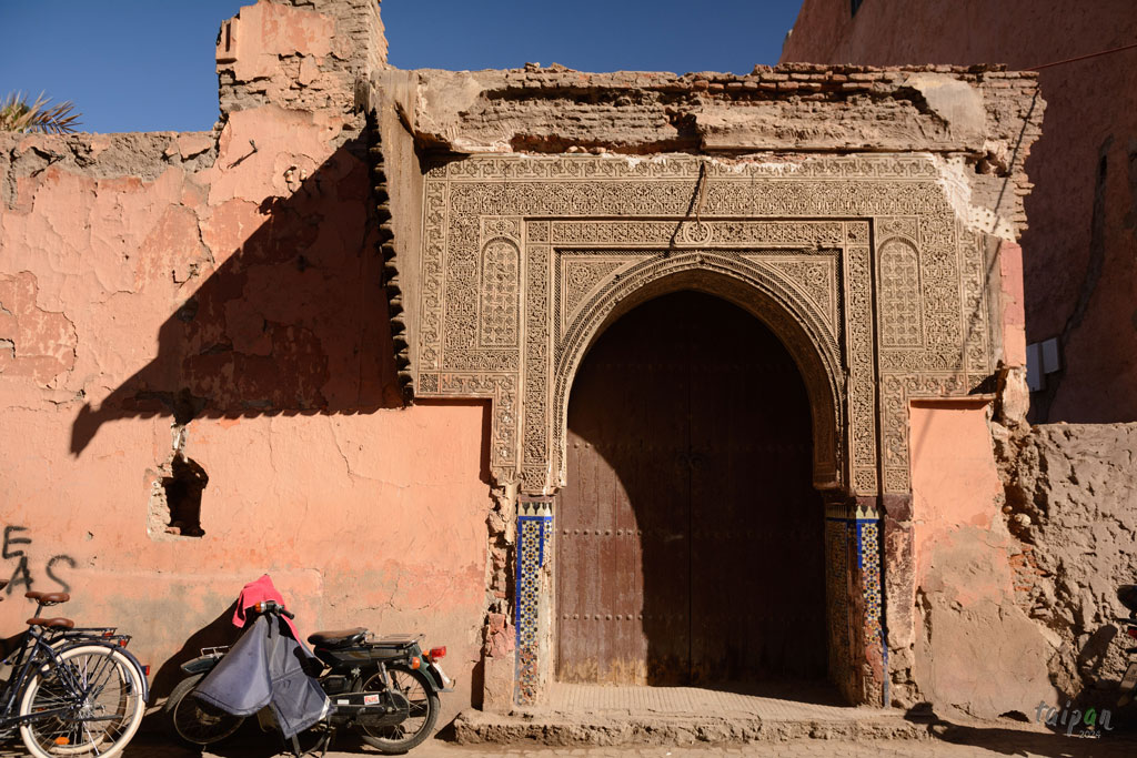 Bogato zdobiony portal drzwiowy popadający w ruinę.
