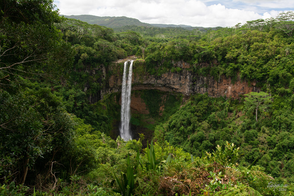 Wodospad Chamarel o wysokość około 100 m. Woda spada z bazaltowego klifu, w pobliżu którego rośnie pierwotna dżungla.
