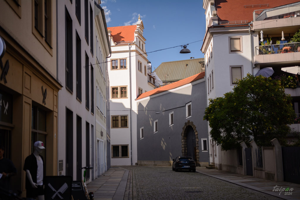 Jedna z uliczek w centrum miasta z budynkiem z oknami wstawionymi pod ukosem.