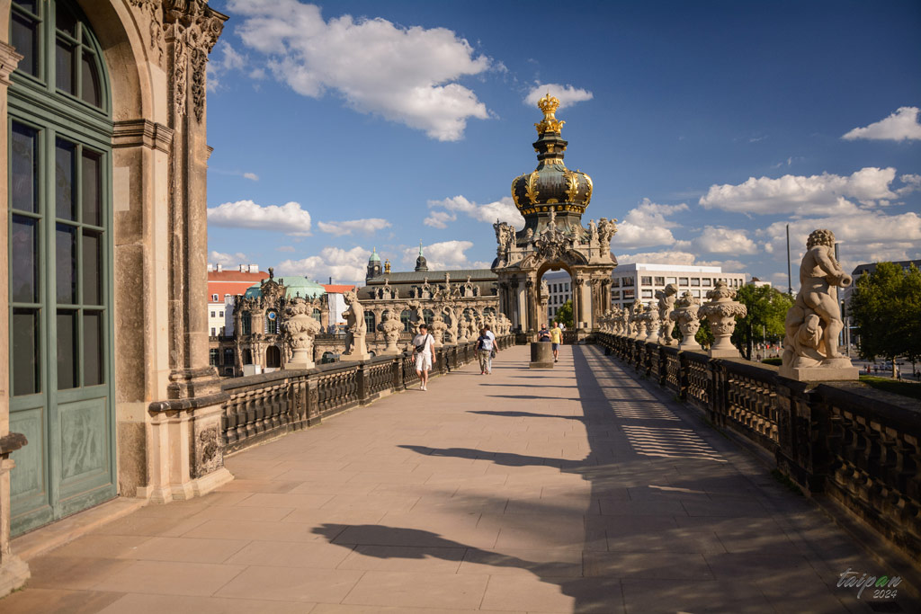 Zwinger jest rokokowym zespółem pałacowym, wzniesionym jako królewska rezydencja Augusta II. Na fasadzie Bramy Koronnej widocznym na zdjęciu znajduje Herb Rzeczypospolitej.