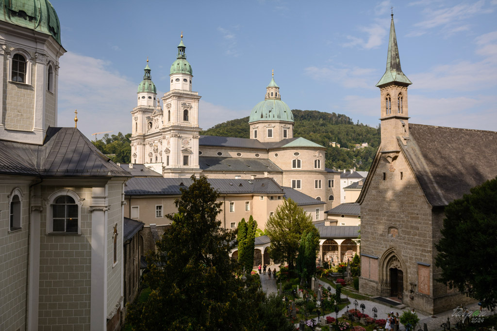Widok z katakumb na kościół i cmentarz Świętego Piotra (Petersfriedhof).