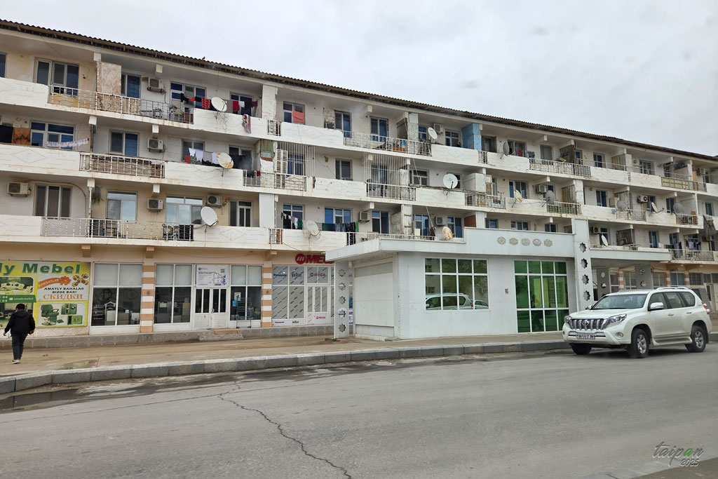 Jeden z budynków wielorodzinnych. Przypomina radzieckie bloki tylko w wersji turkmeńskiej.