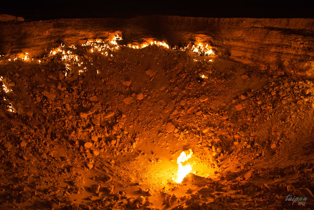 Rejon Derweze jest bogaty w gaz ziemny. W 1971 roku przewiercono płytko położone złoże, w wyniku czego doszło do zapadnięcia się ziemi pozostawiając lej o głębokości około 20 m i średnicy 70 m. Nie chcąc zanieczyszczać gazem atmosfery, radzieccy naukowcy zdecydowali się go podpalić. Zakładano, że złoże wypali się po kilku dniach. Jednak płonie ono do dzisiaj, choć z każdym rokiem w coraz mniej miejscach. Dziś miejsce to nazywane jest "wrotami piekieł".
