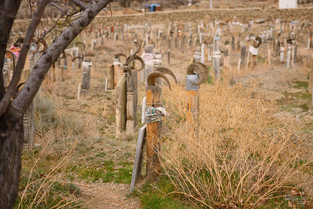 Cmentarz w Nokhur (Nohur) jest jednym z najbardziej unikalnych i intrygujących miejsc w kraju, odzwierciedlający pradawne wierzenia i specyfikę kultury plemienia Nokhur. Położony w górach Kopet-Dag, blisko granicy z Iranem, jest świadectwem synkretyzmu religijnego, gdzie islamskie tradycje przeplatają się z animistycznymi praktykami. Najbardziej charakterystyczną cechą nagrobków w Nokhur są rogate pale lub rogi kozłów górskich (markhurów), które wieńczą wiele grobów. Te zwierzęta są uważane przez miejscową ludność za święte, symbolizujące siłę i wytrzymałość. Uważa się, że rogi kozłów chronią zmarłych przed złymi duchami. Jest to wyraźny przykład starożytnych wierzeń animistycznych, które przetrwały i zostały włączone do lokalnej praktyki islamskiej. Obecnie cmentarz jest zamknięty dla osób z zewnątrz. Można go jedynie oglądać zza murów.