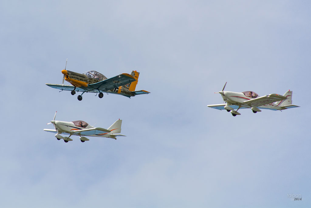 Pokaz lotniczy pary samolotów AT-3 z udziałem Zlin 42M (w historycznym malowaniu) podczas dni otwartych Fundacji Legendy Lotnictwa zorganizowanych na bialskim lotnisku w 2014 roku