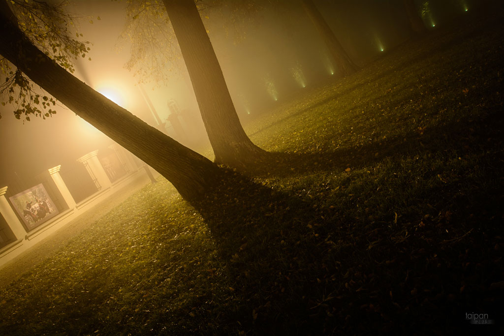 Parku Radziiłów podczas jesiennych mgieł w 2015 roku.